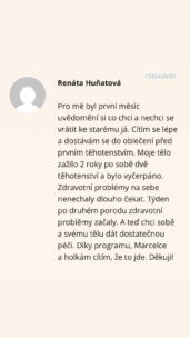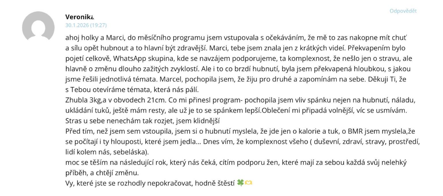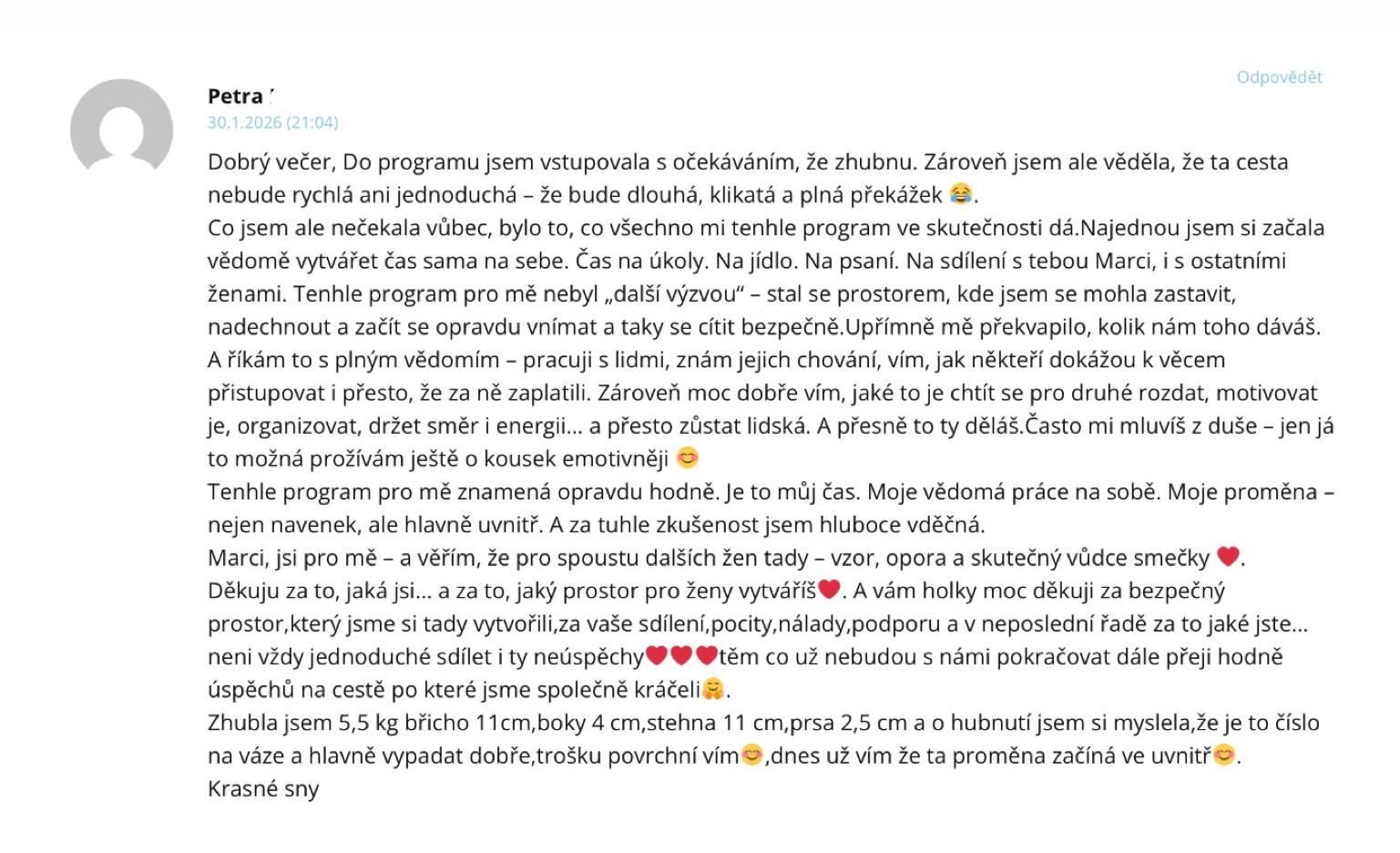 Součástí programu je i speciální WhatsAppová skupina žen, které budou startovat společně s tebou. Za všechny roky mojí praxe jsem došla k přesvědčení, že jedním z klíčů k úspěchu je to, kým se obklopuješ, a právě proto ti chci dát možnost být součástí jedné silné komunity. Čeká tě společná cesta, společný cíl a prostředí žen, které jdou stejným směrem jako ty. Nebudeš na to sama — najdeš tu podporu, motivaci, sdílení zkušeností i pochopení vždy, když to budeš potřebovat. Věřím, že právě komunita často rozhoduje o tom, jestli uspěješ, a proto jsem ji do programu zařadila jako jeden z pilířů celé proměny.